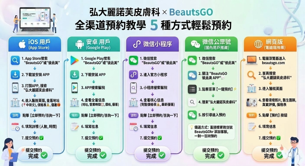 五、弘大麗諾芙皮膚科 × BeautsGO 全渠道預約教學 5 種方式輕鬆預約