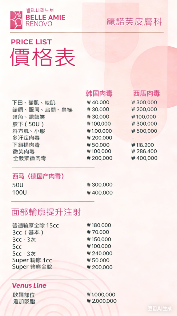 - 全臉:1 次 200 萬韓元 / 3 次 364 萬韓元