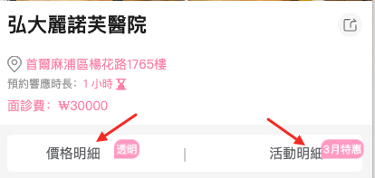 進入醫院專屬頁面,可隨時查看中韓文地址 📍、營業時間 ⏰、當月價格表 💰及平台專屬優惠活動。