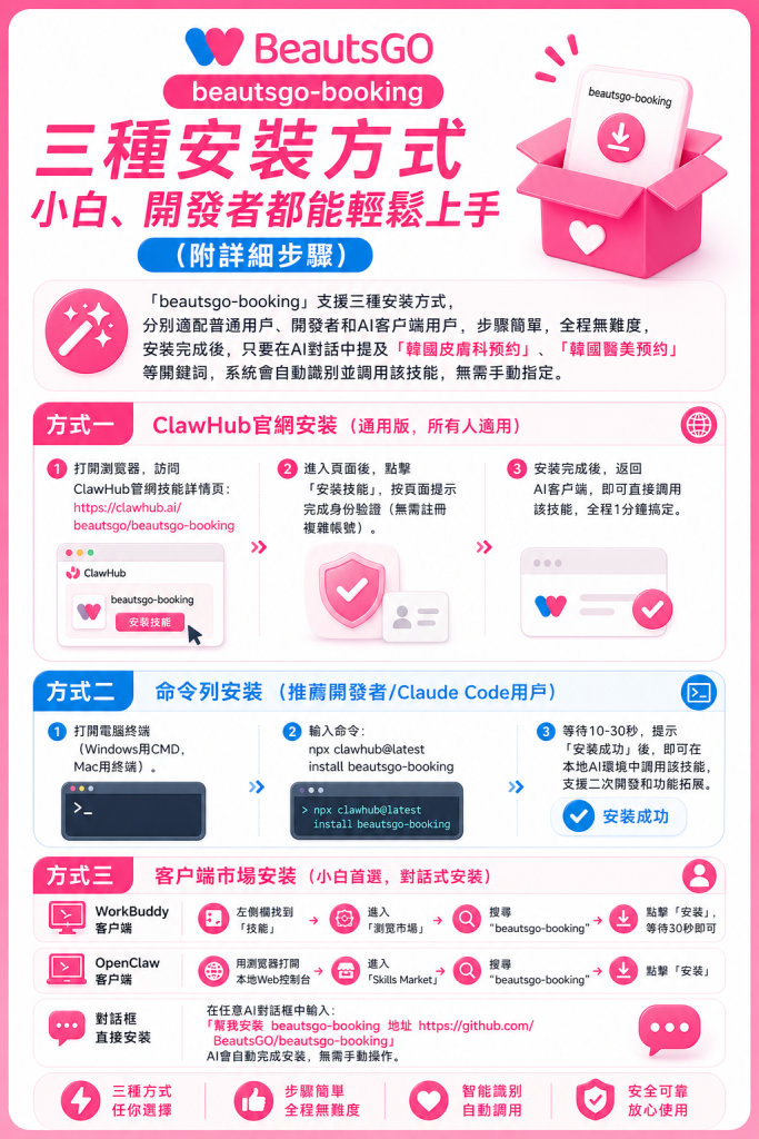 「beautsgo-booking」支援三種安裝方式,分別適配一般用戶、開發者與AI用戶端用戶,步驟簡單,全程無難度,安裝完成後,只要在AI對話中提及「韓國皮膚科預約」「韓國醫美預約」等關鍵字,系統會自動識別並呼叫該技能,無需手動指定。
