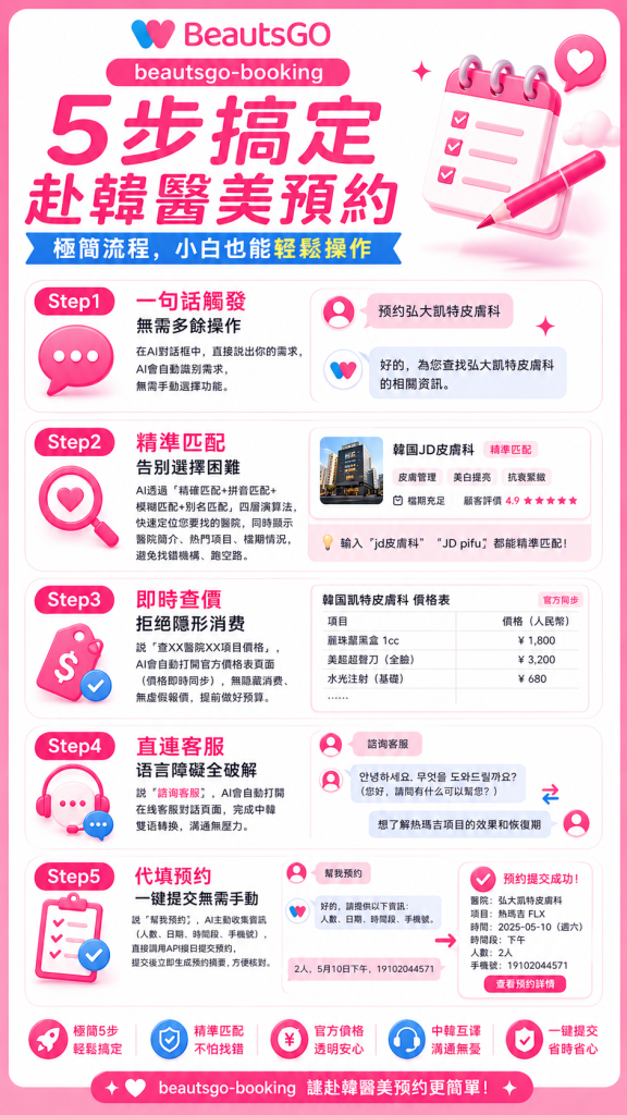 正是在這樣的市場需求下,「AI智選預約」成為赴韓醫美的新刚需——無需下載任何APP、無需手動填寫繁瑣表單、無需擔心語言不通,一個AI Agent就能全程代辦,從匹配合適的醫院,到提交預約、查詢價格,一站式搞定所有環節,而「beautsgo-booking」,就是目前市場上最成熟、最可靠的赴韓醫美AI預約工具。